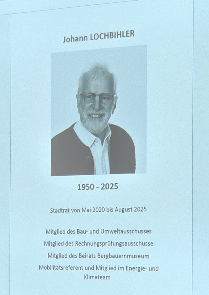 Zu Beginn der Stadtratssitzung gedachten die Anwesenden mit einer Schweigeminute des verstorbenen Mitglieds des Stadtrates, Johann Lochbihler, der am 9. August 2025 verstorben ist.