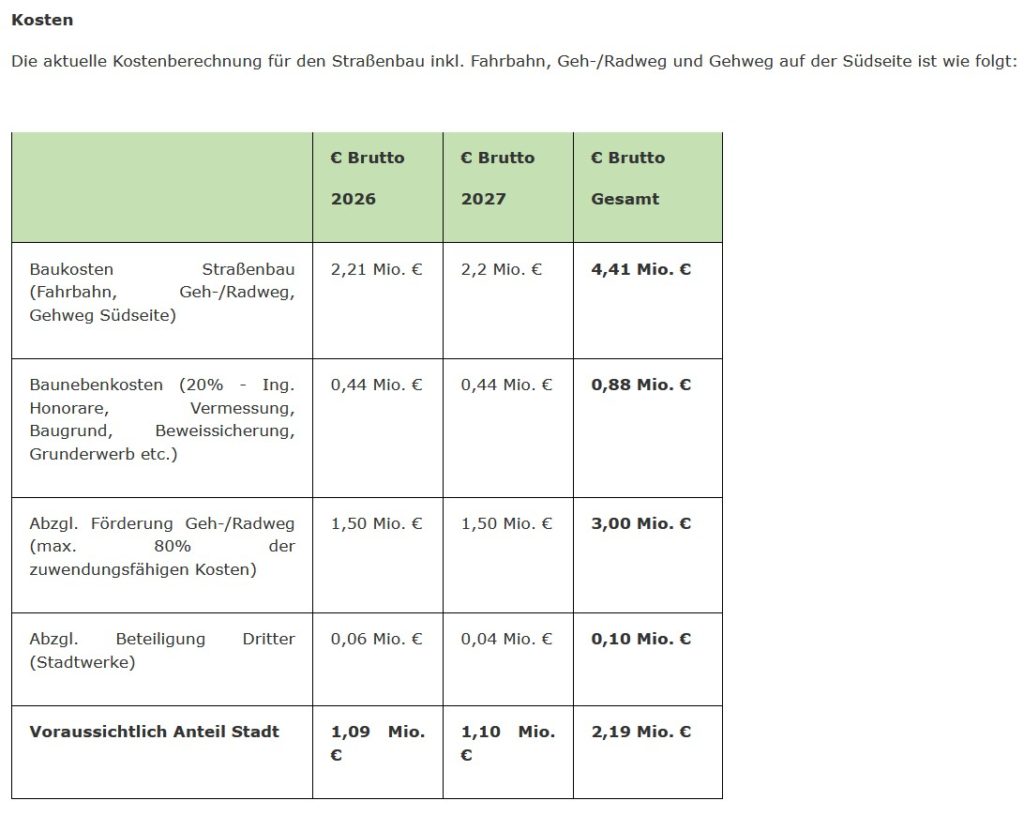 Der Stadtrat nahm die vorgestellte Planung zur Kenntnis und beschloss einstimmig die Umsetzung der Baumaßnahme in den Jahren 2026 und 2027. Die erforderlichen finanziellen Mittel werden in den Haushalt für die Jahre 2026 und 2027 aufgenommen.